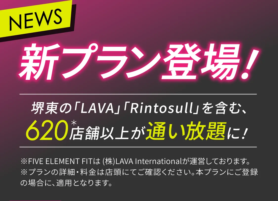 • ※利用対象店舗:FIVE ELEMENT FIT、マシンピラティスRintosull、ホットヨガLAVA、暗闇キックボクシングBurnesStyle、ボクシング×筋トレUPPER 9 各ブランド全店舗