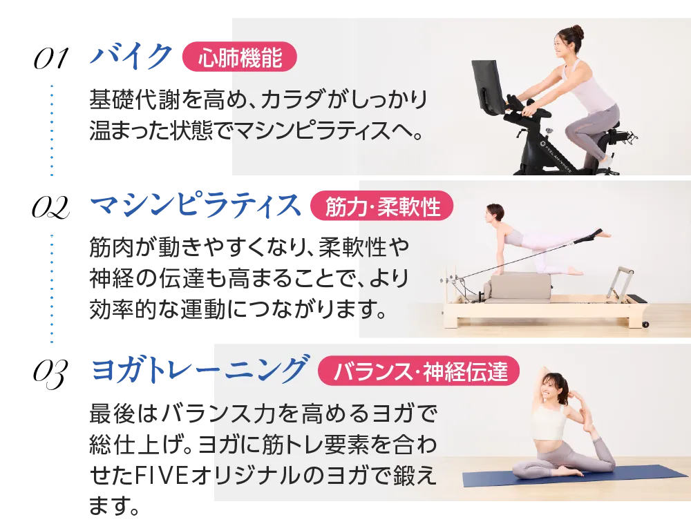マシンピラティスの前後に2つの運動を組み合わせることで、ただ「動くだけ」ではない、燃やす・整える・鍛えるを循環させる、新しい運動体験を提供します。